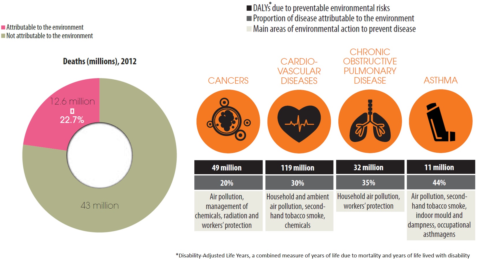 This is illustrated by the 2016 WHO report, which estimates that nearly a quarter (23%) of premature deaths in the world in 2012 were attributable to the environment, i.e. 12.6 million people who died before the age of 65 (Prüss-Ustün et al., 2016).
