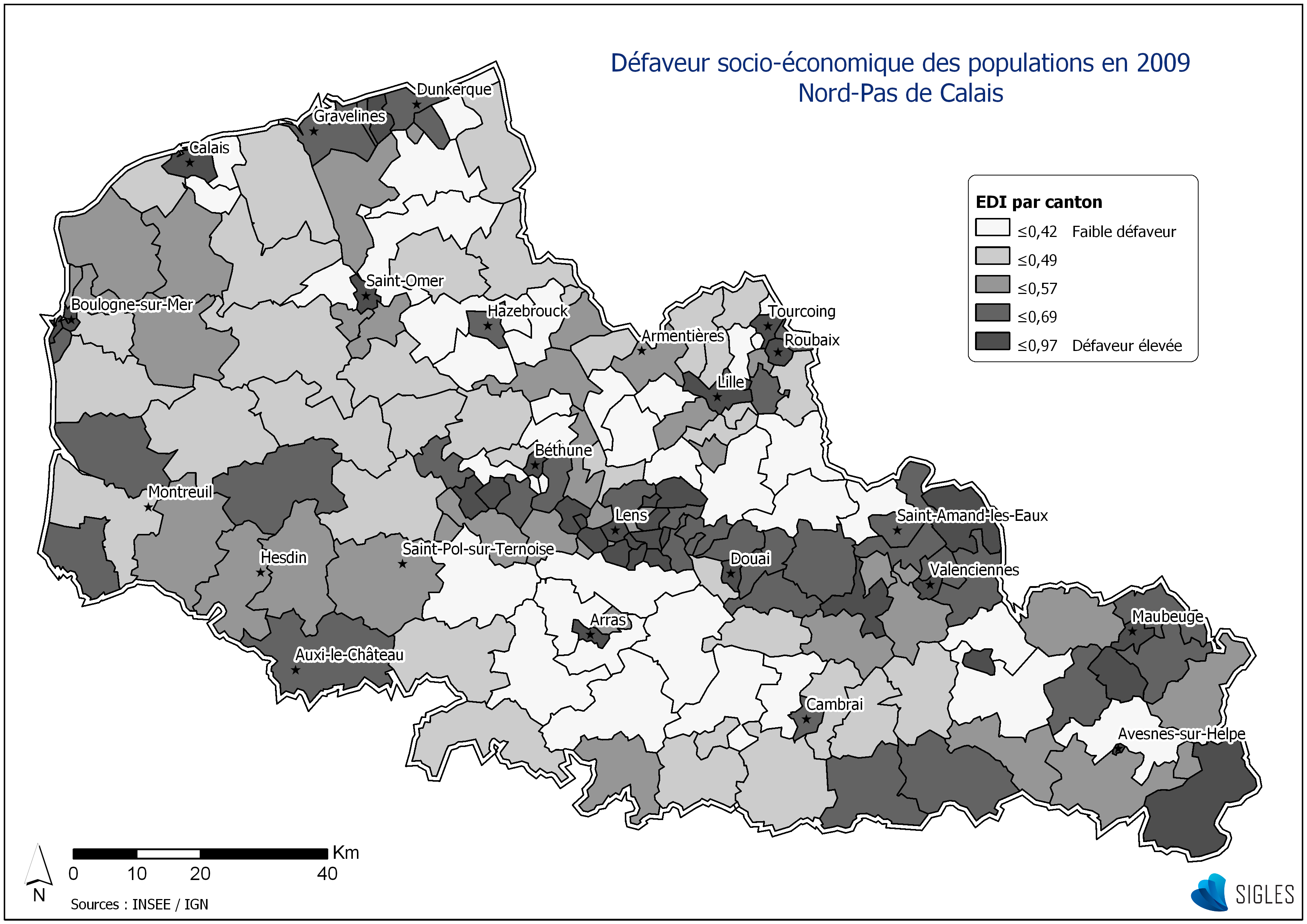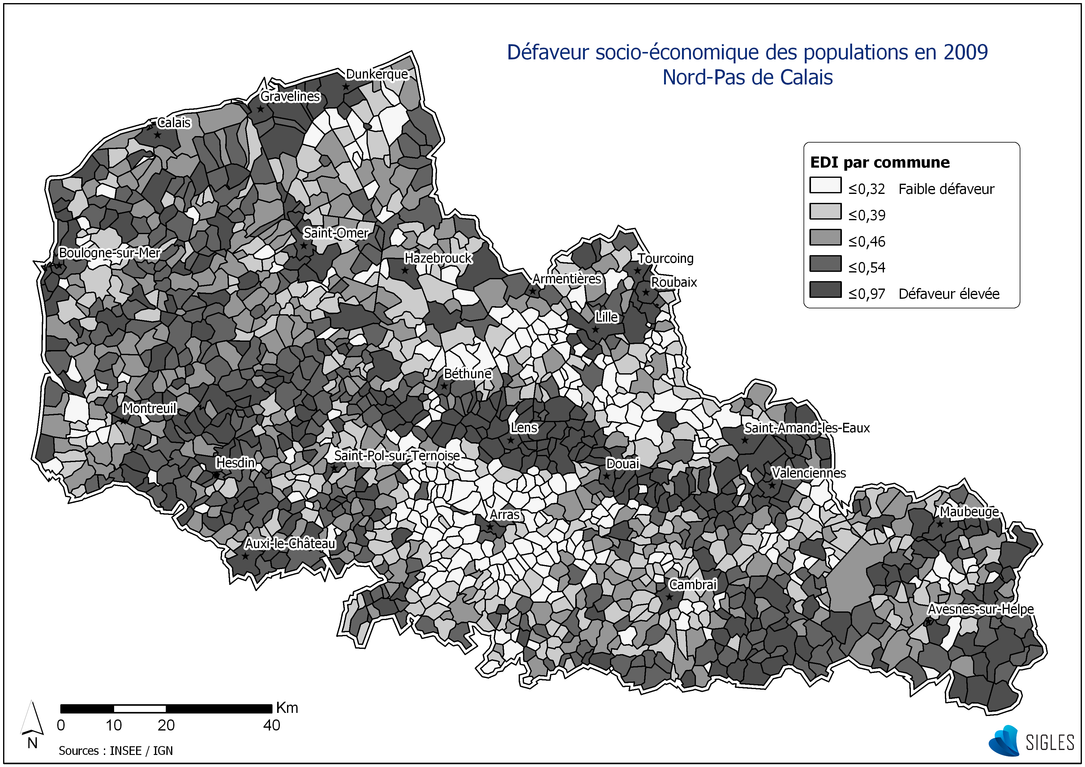 Score = 0.11 x “Surpeuplement” + 0.34 x “Pas d’accès au chauffage central ou électrique” + 0.55 x “Non propriétaires” + 0.47 x “Chômage” + 0.23 x “Nationalité́ estrangère” + 0.52 x “Pas d’accès à une voiture” + 0.37 x “Ouvriers non qualifiés-ouvriers agricoles” + 0.45 x “Ménages avec au moins 6 personnes” + 0.19 x “Faible niveau d’étude” + 0.41 x “Familles monoparentales”.
